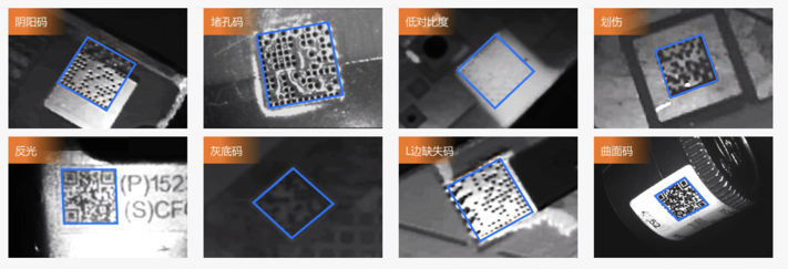 全自主知识产权算法,卓越的DPM识读性能,对阴阳码、堵孔码、低对比度、划伤、反光、曲面码等疑难码有卓越的识读性能。以下复杂情况仍可高效读码